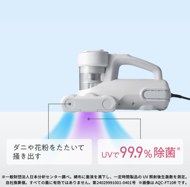 AQUAのふとんクリーナーは、徹底的に「清潔さ」にこだわったモデルです。UV照射と同時に吸引することで、細菌を99.9%除菌※1。