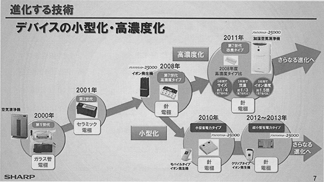 上の図は配布資料で、プラズマクラスターのデバイスの歴史です。 2000年から始まっています。 多分、当時は取りあえずの商品化だったと思います。