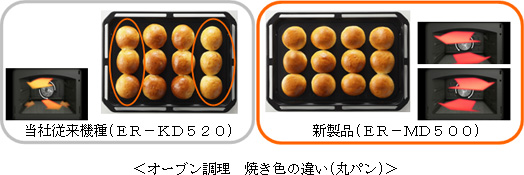 ■左右交互の風向で均一な焼き上がりを目指す「焼き色上手なくるりん熱風」(ER-MD500のみに搭載)