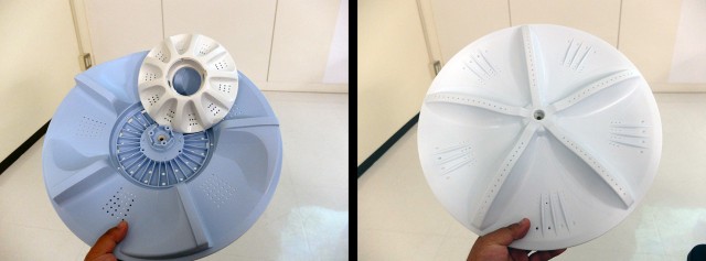 AQUAは今回、次の2つをコンセプトにパルセーターを見直しました。1)パルセーターに加わる負荷(洗濯物の重さのこと)を減らし、効果的に衣類を撹拌させることができないか?