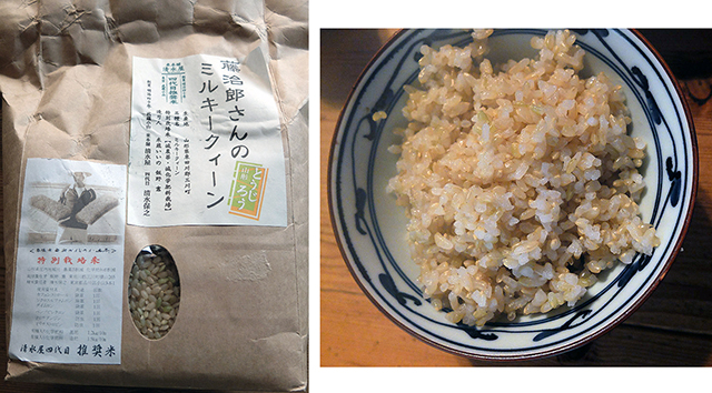 左)今回使用したミルキークィーン。玄米状態で販売されている。