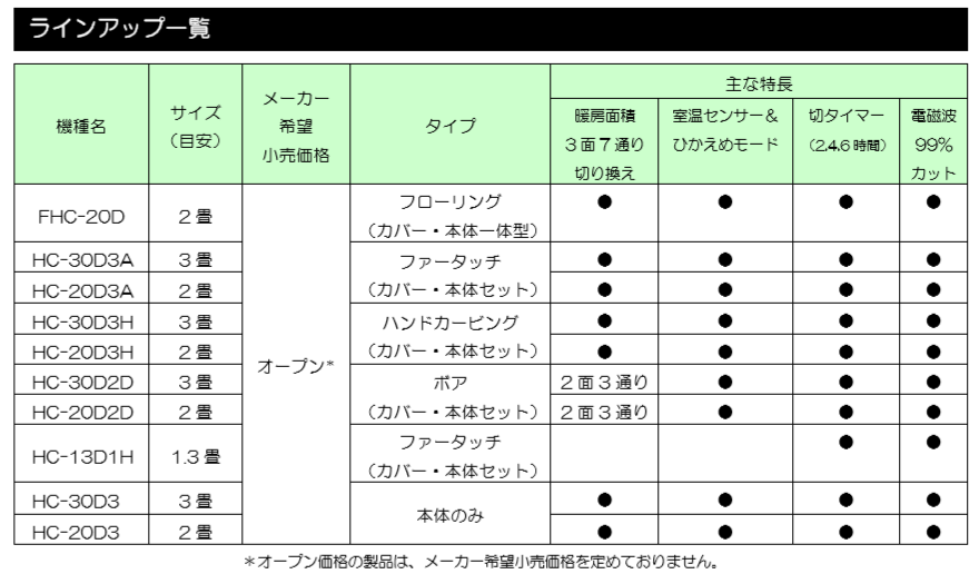 その他の機能として、少ない電力で1/3 面ずつ順に暖めることでブレーカーダウンを少なくする「電力1/3モード」機能。カバー部は抗菌防臭加工を採用し、自宅での手洗いが可能です。なかでもフローリングタイプは表面素材への抗菌・防カビ・防水加工による手入れのしやすさがあります。