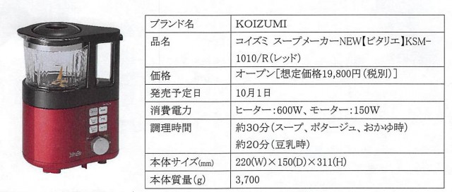 小泉成器(株)(ブランド名:KOIZUMI)から、野菜中心のポタージュ、スープ、おかゆがボタンひとつで簡単にできるビタリエに、豆乳の調理機能を追加した、「コイズミ スープメーカーNEW【ビタリエ】KSM-1010/Rを、オープン価格(市場想定売価:19,800円(税抜))で、10月1日に発売されました。