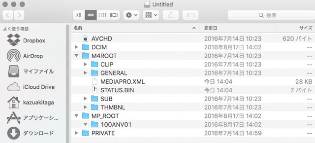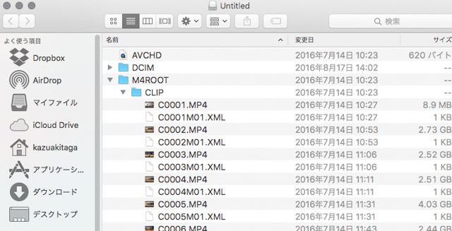 MACにムービーを接続したところ。CLIPの中に映像ファイルがある。