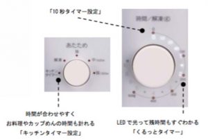 「くるっとタイマー」は当商品の最大の特徴で、LEDで光って見やすく、ダイヤルを回すだけのシンプル操作を実現。10秒タイマー設 定により、少しだけあたためたい時の設定が可能となりました。また「キッチンタイマー機能」の搭載が「あたためる」「解凍する」 といった電子レンジの基本使用シーン以外にも活用の場を広げるなど、単身世帯の“欲しい”工夫を具現化いたしました。