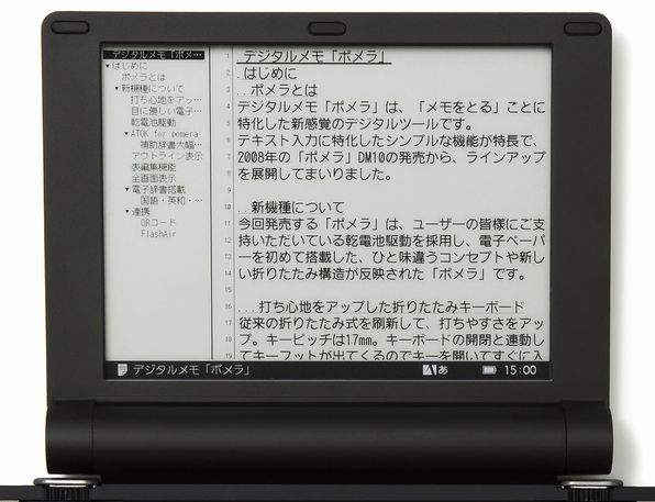 観音開きの折りたたみキーボードを搭載。キーボードの開閉と連動して、格納されているキーフットが自動的に出てきて接地面が固定されるので、安定したタイピングが可能です。キーピッチは横17mm、縦15.5mmと、コンパクトなボディながらもノートパソコン並みの打ち心地を実現しました。■長時間作業でも疲れにくい、目に優しい電子ペーパー「E Ink」を初採用 「ポメラ」シリーズで初めてE Ink社の電子ペーパーディスプレイを採用しました。紙に印刷されたようにくっきりと文字が表示されるので、 バックライトなしでも文字が見やすく、長時間の作業も快適に行えます。