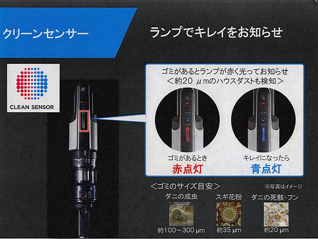 この他にもヘッドもよくできていますし、「親子ノズル」「ガバとりノズル」も付いている上、20μmのゴミを知らせるクリーンセンサーも付いています。20μmだと、ダニの成虫、スギ花粉は元より、ダニの死骸・フンなど、アレルゲン物質の有無が分かります。