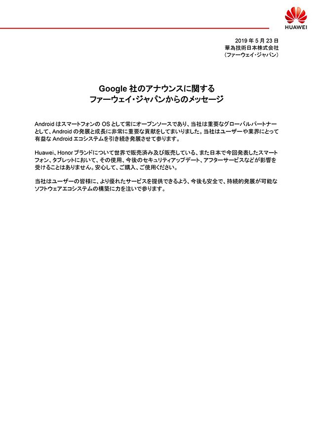 華為技術日本株式会社(ファーウェイ・ジャパン)から、Google社のアナウンスに関するメッセージが届きました。