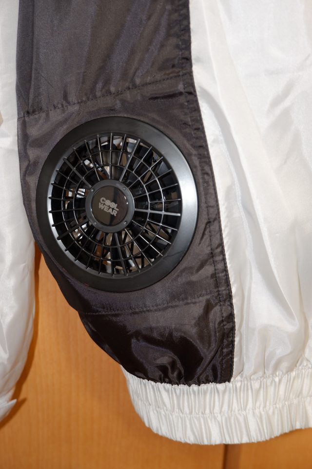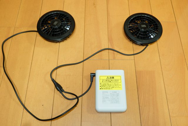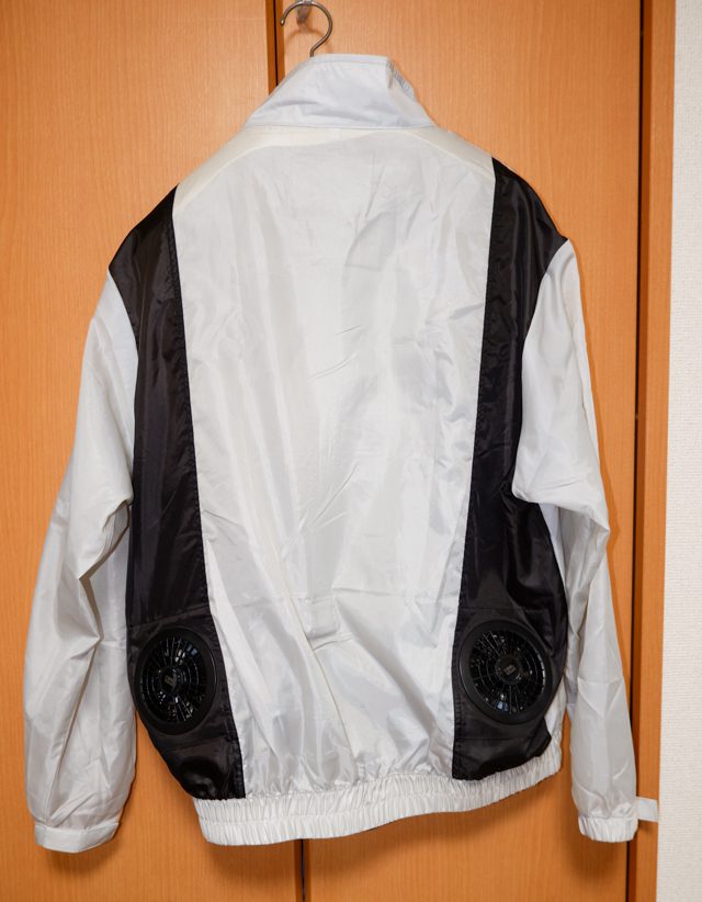 袋を開けると、背面に2つの穴が空いているウィンドブレーカー、ファン2つ、コントロール部を持ったバッテリー、そしてケーブルが出てきます。単純にバッテリーからケーブルでファンに電気を供給、ファンを回す仕組みです。