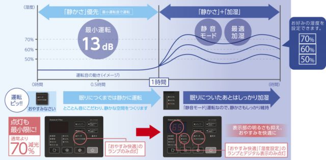 「おやすみ快適」は就寝時の使用を想定し、静かさを重視しながら加湿する新機能です。眠りにつくまでの1時間は静かさを優先して最小運転音で運転し、その後はお好みの設定湿度に合わせた加湿運転でうるおいもキープします従来の就寝時を想定したモード「おやすみ加湿」では、設定湿度を50%から変更できませんでした。一方、新機能「おやすみ快適」では50%、60%、70%からお好みの湿度を設定できるので、より快適な環境をつくることができます。