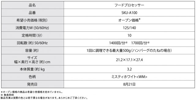 既に発売しているミキサーSKT-A100、SKR-V250と合わせて「良い音設計シリーズ」として展開し、暮らしに寄り添った音と使いやすさにこだわった快適な調理で幸せな団らんに貢献してまいります。