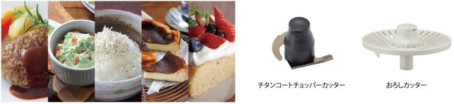 ミンチ・ペースト・おろし・生地・ホイップなど1台で5役の下ごしらえがらくにできて、時短調理に活躍します。おろし専用カッターも付属しているので大根おろしも簡単に。