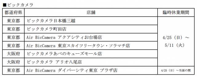 政府による緊急事態宣言に伴う外出自粛要請を受け、お客様 並び に従業員の新型コロナウイルス感染防止の観点から、一部店舗を臨時休業するという連絡がビックカメラよりありました。