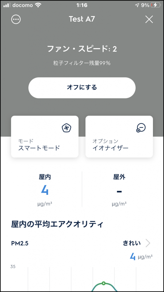 コネクティドのメリットは、スマートホンをリモコンの様に使えるので、操作が楽になることもありますが、エアクオリティとして「PM2.5」「PM1」「PM10」「TVOC(総揮発性有機化合物)」「eCO2(推定 二酸化炭素量)」「湿度」「温度」という、空気質データーが表示されるところがいいです。CO2量は換気の目安として重要ですが、最近まで蔑ろにされて来ました。それは測定器が割と大きくなるためですが、推定にせよC02量がわかるのは嬉しいです。これがバッチリわかります。