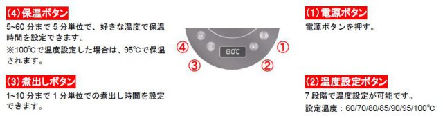 ●作り方 1)本体に水を入れ、90℃に設定する。