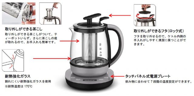 タッチパネル式の電源プレートで、7段階(60、70、80、85、90、95、100℃)の温度設定ができる人気の温度コントロールタイプ。好みの温度に設定してお湯を沸かした後は、5~60分間まで5分単位で保温ができます。取り外しができるロック式のフタや、底を簡単に外すことができる“茶こし”で、 使用後のお手入れもしやすく、すみずみまで清潔に保つことができます。