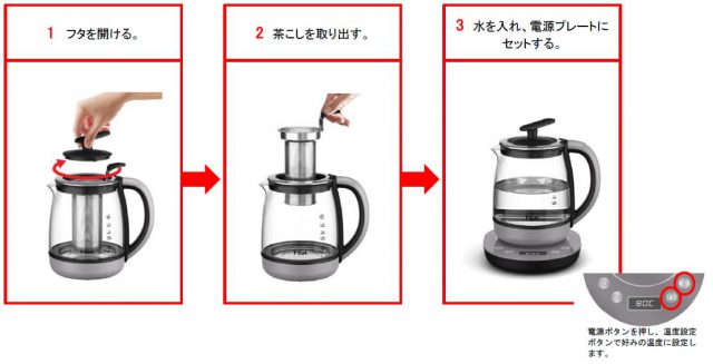 お湯を沸かすときは、茶こしを取り出して温度コントロールができる電気ケトルとして7段階(60、70、80、85、90、95、100℃)からお好みの温度に設定します。●応用の使い方:アレンジティー