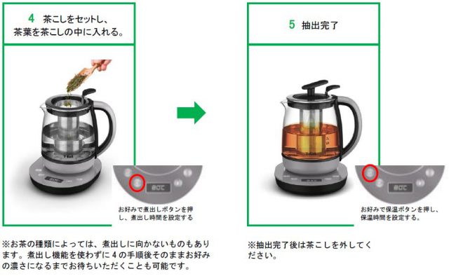 お湯を沸かした後は、茶こしを使ってティーポットのように使うことができます。さらに、フルーツティーや麦茶などは「煮出しボタン」で適切な時間(1~10分)を設定して、煮出すことも可能です。