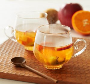 3)茶こしを取り出し、フルーツを加え、10分煮出し、カップに注ぐ。