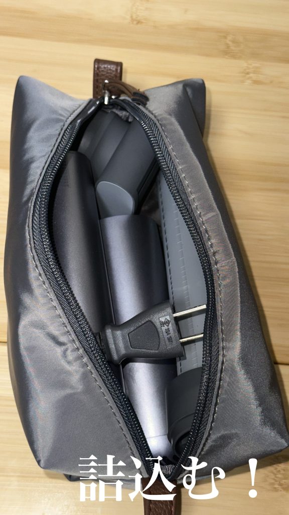携帯ポーチは、20×10×9cm。ドライヤー本体のハンドル部は折り畳めるものの、曲がるものの、ブッシュ(電源コードの本体側根元)が曲がりません。ケーブルも太いので少々曲げにくいですし、ブッシュはケーブルが一番断線しやすいところ。むやみやたらに、力をかけるのは避けた方がいいです。他のメーカーですが、袋からはみ出さないと入れることができないモデルに当たった経験があります。袋なら、まだそんな形の緊急対処も可能ですが、ポケットはポーチです。